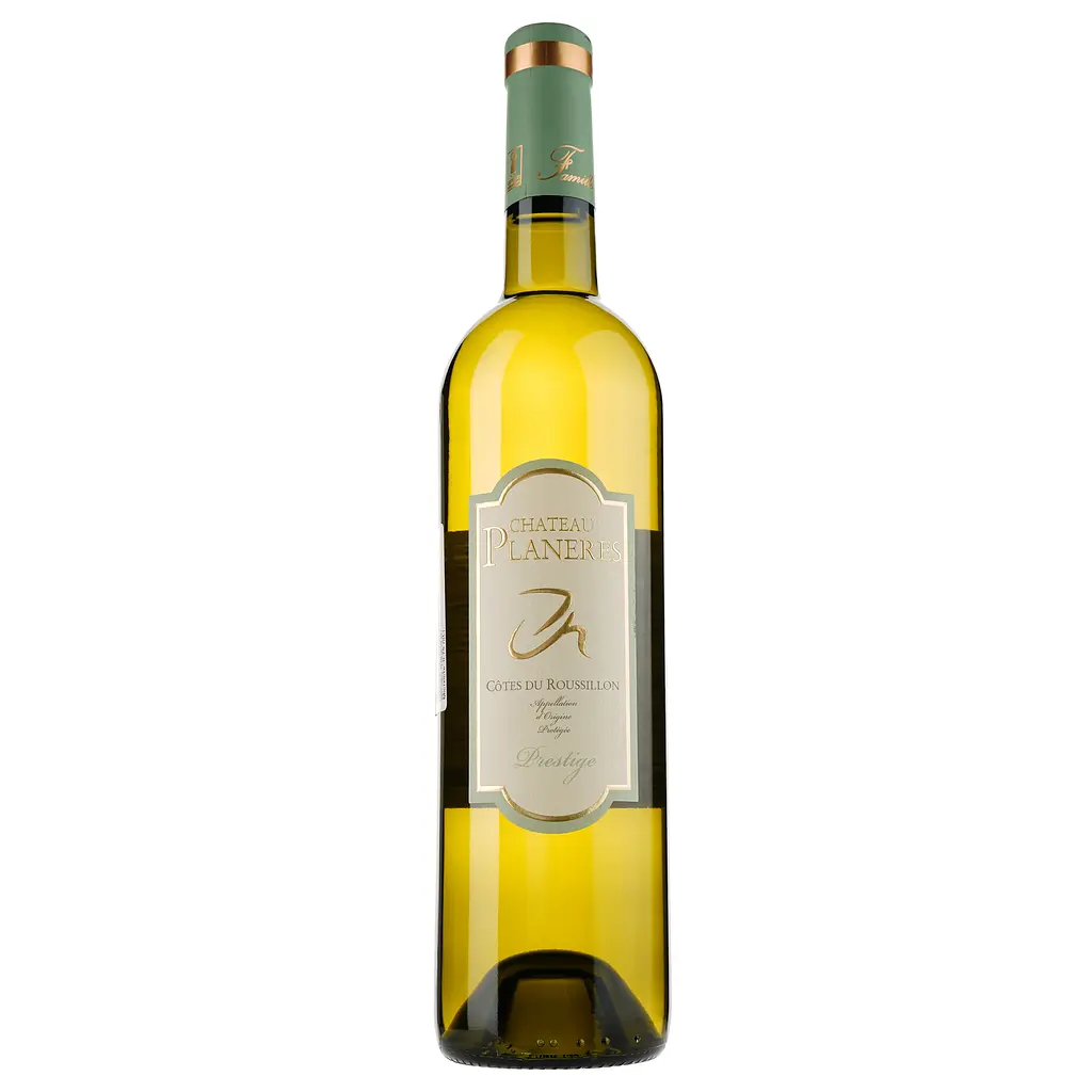 Вино Chateau Planeres Prestige Blanc AOP Cotes du Roussillon золотистого цвета с зелеными отблесками. Элегантный, сложный аромат раскрывается нотками сливы мирабель и цветочными оттенками, в сочетании с лимонными и другими цитрусовыми нюансами. Хорошо структурированный, свежий вкус наполнен нотами цитрусовых и экзотических фруктов с минеральными оттенками. Послевкусие устойчивое, слегка соленое, с легкой терпкостью.