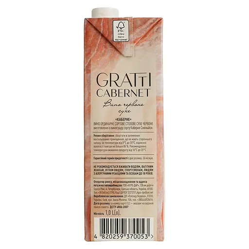 Вино Gratti Cabernet имеет насыщенный рубиновый цвет. В его аромате переплетаются нотки спелых красных ягод и черноплодной рябины. Вкус вина насыщен, гармоничен и полон. Вино ординарное сортовое столовое сухое красное, производится из винограда сорта Каберне Совиньон, который выращивается на юге Одесской области. Виноград созревает под лучами бессарабского солнца, что придает ему особенное качество.