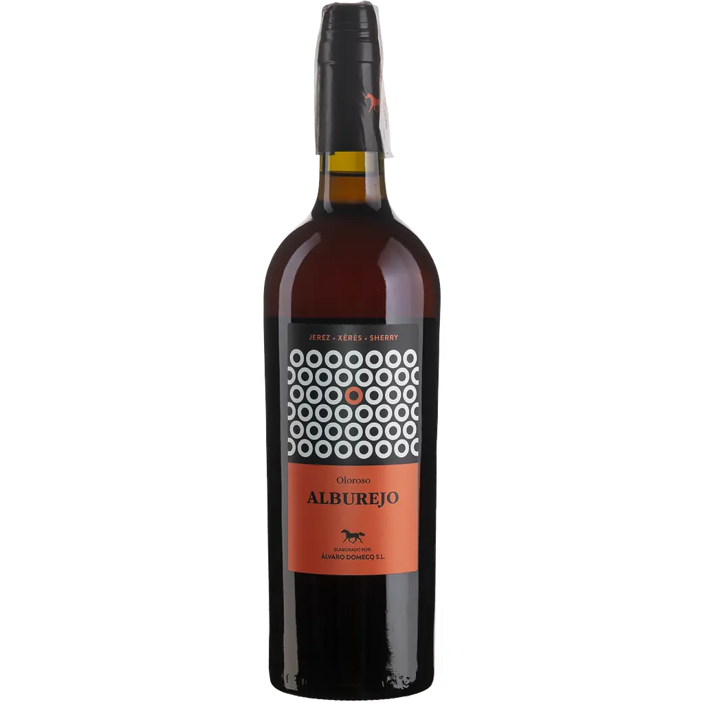 Вино херес Bodegas Alvaro Domecq (Бодегас Альваро Домек) Oloroso Alburejo обладает насыщенным цветом красного дерева.