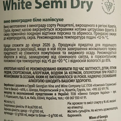 Качественный представитель грузинского виноделия, привлекающий свою свежесть, легкость и гармоничный вкус. Оно изготовлено из знаменитого сорта винограда Ркацители, традиционно выращиваемого в солнечном регионе Кахетия, известном своим теплым климатом и благоприятными условиями для виноградарства.