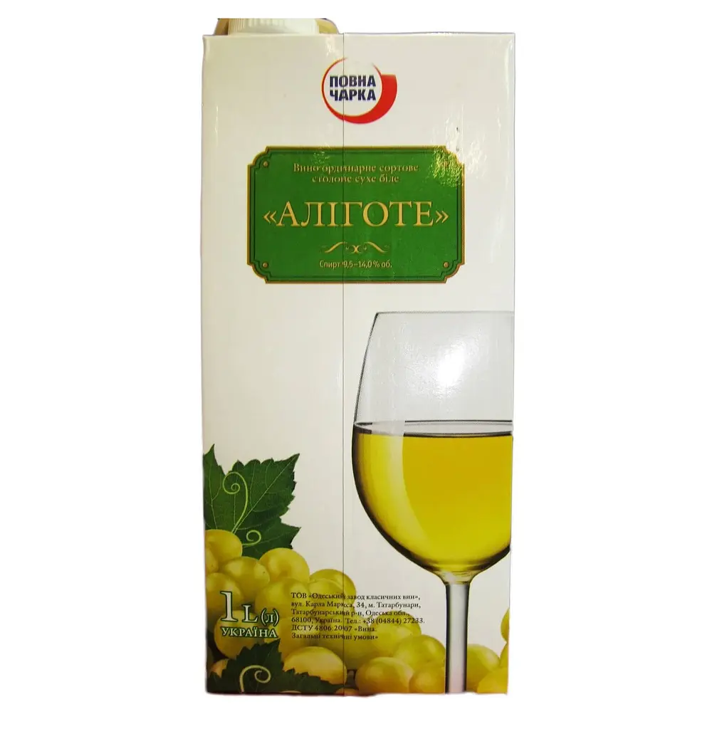 Вино Повна Чарка Алиготе - ординарное столовое вино изготовлено из отборных сортов винограда Алиготе.