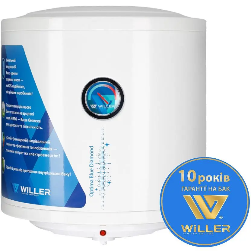 Willer EV30DR Optima - надежный накопительный электрический бойлер цилиндрической формы объемом 30 литров. Оснащен двумя защищенными (сухими) нагревательными элементами общей мощностью 1.5 кВт. ТЭНы защищены от воды специальным кожухом с эмалированным покрытием, что позволяет продлить срок службы нагревательных элементов и бойлера. Внутренний бак изготовлен из стали, покрытой титанокварцевой эмалью, и защитный магниевый анод обеспечивают длительный срок эксплуатации.