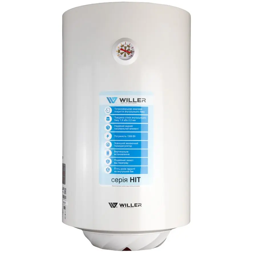 Надежный накопительный электрический водонагреватель WILLER EV30R-HIT цилиндрической формы объемом 30 литров. Оснащен медным погружным (мокрым) нагревательным элементом мощностью 1,5 кВт. Внутренний бак, изготовленный из стали, покрытой титанокварцевой эмалью, и защитный магниевый анод обеспечивают длительный срок эксплуатации. Сфера применения - нагрев воды для бытовых целей, для душа и ванны. Для использования в доме, квартире, на даче.