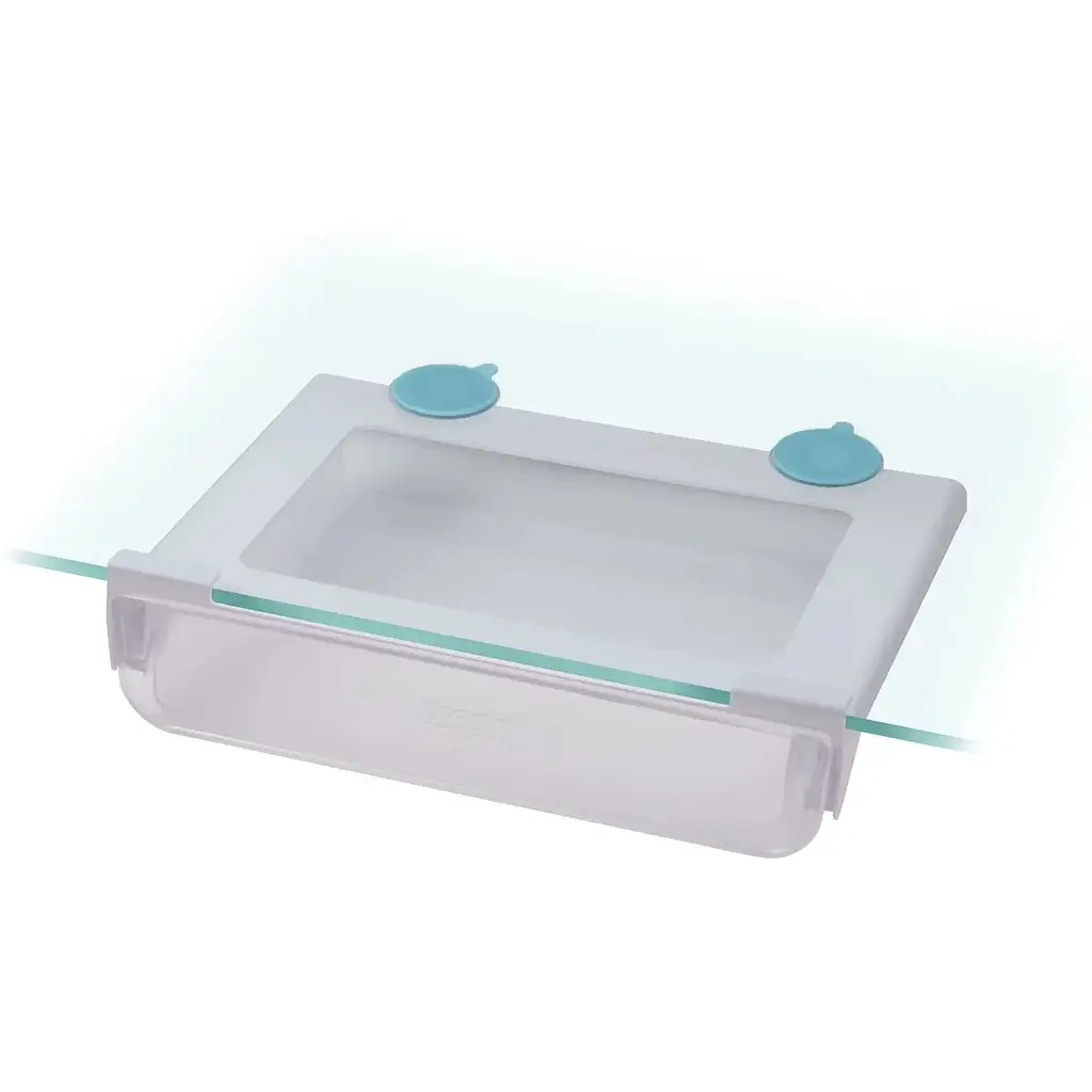 Способ применения: ящик аккуратно закрепляется на существующей полке и надежно закрепляется сзади с помощью двух присосок, чтобы изменить положение или снять для чистки, просто отпустите присоски и снова подсоедините.