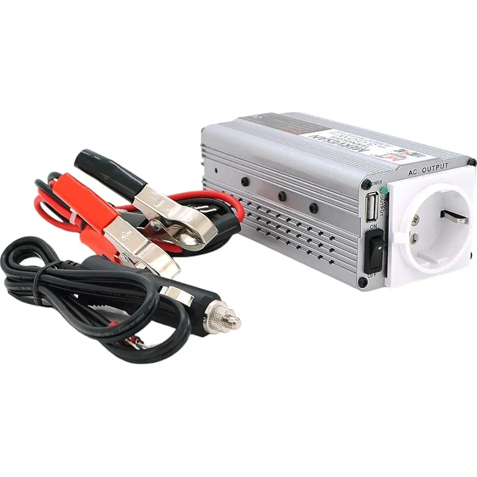 Инвертор напряжения Mervesan MSI300, 12V/220V, 300Вт, 12/220V, approximated, 1 розетка, клемы. Предназначен для преобразования постоянного тока 12 В в переменный ток 220В / 50Гц. Используется для зарядки и работы: ноутбуков, видеокамер, телефонов, всевозможной аудио и видеотехники и прочих электроприборов. Для удобного пользования есть разъем для подключения ЗУ: стандартная розетка 1шт. Встроенная защита от перегрузок, температурная защита, звуковое оповещение при низком входном напряжении. Важно! Не рекомендуется для использования циркуляционных насосов в котлах и других приборов работающих с трансформаторами.