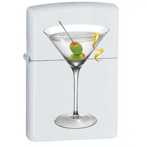 Классическая зажигалка бензиновая Zippo белого цвета с матовым покрытием. Благодаря нанесению краски методом высокотемпературного спекания корпус не подвержен выцветанию. На лицевой стороне изображен бокал из мартини. Отличная модель для людей, получающих удовольствие от жизни.