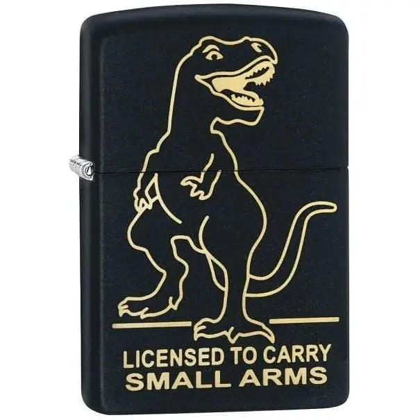 Зажигалка Zippo Licensed to Carry. Юмористическое изображение T-Rex выгравировано лазером и является изюминкой черной матовой зажигалки Zippo Licensed to Carry. Прочный латунный корпус устойчив к ушибам и появлению коррозии, а пожизненная гарантия от производителя только подтверждает ее несравненное качество. Благодаря специальному ветрозащитному механизму легко функционирует в любых условиях при любой погоде. Торопитесь, и она станет именно Ваша.