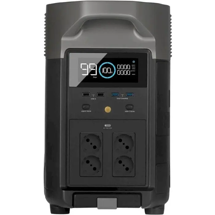 Комплектация: DELTA Pro Зарядный кабель переменного тока Зарядный кабель для прикуривателя Кабель от DC5521 до DC5525 Чехол на ручку Инструкция по эксплуатации Размеры: 635 × 284 × 417 мм Цвет: Серо-черный Вес: 45 кг Характеристики разъемов: Выход USB-A (x2): 5 В, 2.4 А, макс. 12 Вт. Порт быстрой зарядки USB-A (x2): 5 В, 2.4 А/9 В, 2 А/12 В, 1.5 А, макс. 18 Вт Выход USB-C(x2): 5/9/12/15/20 В, 5 А, макс. 100 Вт. Выход питания автомобиля: 12.6В, 10А, 126Вт макс.