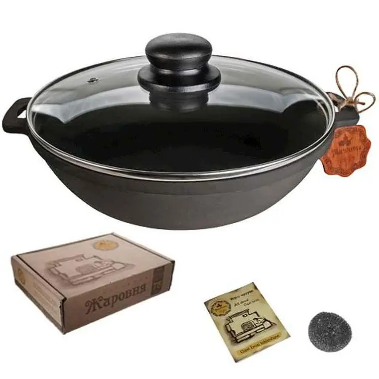 Железо с содержанием углерода более 2.14%. Если меньше, то сталь. Железо в чистом виде! В нашем случае без какого-либо покрытия (без эмали). Потому может ржаветь, если оставлять мокрой! Трудно! Не путать со старой бабушкиной чугунной сковородкой из литого алюминия. Покрытие на чугунной посуде образуется в процессе прокаливания (если новая). А в процессе приготовления оно постоянно обновляется. Но это не антипригарное покрытие, как почему-то думают (потому что черное), а самая тонкая полимерная пленка из запеченного масла (жира), которая защищает ваши сосуды от коррозии, а также обладает гидрофобными свойствами (отталкивает воду). И потому, чтобы не прилипало, готовить нужно с растительным маслом. Разве что лепешки можно без масла печь. И да. На чугуне можно печь. Потому что он кроме всего прочего имеет высокую тепловую эмиссию. Это чуть ли не главное преимущество чугуна. Способность отдавать тепло. Тепло от хорошо прогретой сковороды вы почувствуете в полуметре! Подобного эффекта вам от других материалов не получить. Тепловая эмиссия у чугуна в 10 раз выше, чем у алюминия. Это означает, что продукт готовится не только в месте касания поверхности, но и практически полностью.