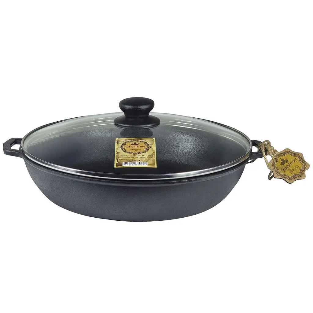 Наша мастерская изготовлена из литого чугуна. Оснащена двумя литыми ручками-ушками для прихваток и подвешивания. Глубокая чугунная сковорода удобна для жарки и тушения. Можно использовать на плите и в духовке. Чугунный корпус равномерно нагревается, выдерживает высокие температуры. комплекте жаропрочная стеклянная крышка. Жаровня упакована в фирменную картонную коробку и станет хорошим подарком.