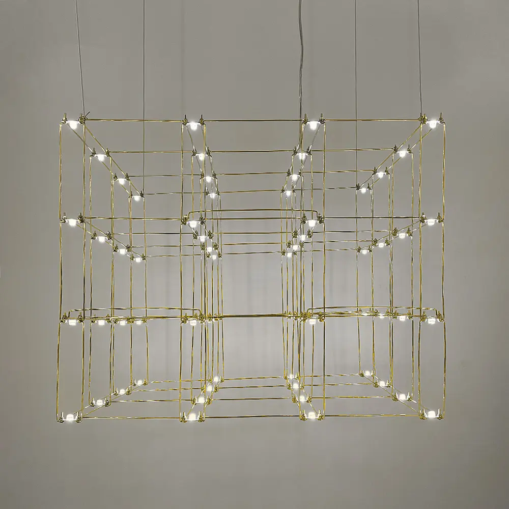 Новая серия геометрических люстр - это произведение искусства, сочетающее современный дизайн и функциональность. Их форма представляет собой вытянутый куб/параллелепипед с прямыми геометрическими линиями, выполненными из металлической проволоки золотого цвета. Серия включает три люстры размером: 72х60х60 см, 100х72х60 см и 120х60х60 см. На углах параллелепипеда и на пересечении металлической проволоки размещаются лампочки (они идут в комплекте), которые обеспечивают нейтральный дневной свет, создавая приятную непринужденную атмосферу в помещении. Общая мощность светильника составляет 43 Вт. Потолочная основа размером 25х15х4 см с монтажной планкой 15 см и 4-мя тросами обеспечивает надежное крепление. Такой метод крепления позволит легко установить люстру на необходимой высоте от 65 до 230 см. Эти люстры станут стильным акцентом в любом современном интерьере, придавая ему элегантности и уникальности. Количество источников света: 60 Тип помещения: Люстры для гостиной (в зал) Форма_изделия: Куб Серия: Cube Цвет основы: Золотой Размер потолочной основы: 25х15х4 см Максимальная высота: 230 см Минимальная высота: 65 см Материал основы: Металл Размер монтажной планки: 15 см Тип крепления: Монтажная планка Мощность (Вт): 43