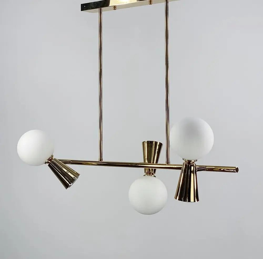 Люстра в золотом металлическом корпусе с 3-мя или 5-ю плафонами на два источника света: стеклянный плафон-шар (белого цвета) с цоколем G9 - 3 или 5 шт металлический плафон в виде спота (конусообразный) с цоколем GU10 - 3 или 5 шт Представляем серию интерьерных осветительных приборов ABELINA со составными двойными плафонами в форме шара и конуса. Одним из преимуществ этих светильников является регулирующий механизм на основе крепления плафона. Серия ABELINA в золотом цвете корпуса с белым плафоном (содержащими плафоны). круглая люстра (на 6 двойных плафонов, размещенных по кругу корпуса) удлиненная люстра (на 3 или 5 двойных плафонов) бра торшер настольная лампа Серия: YG 8006 GD Цвет основы: Золотой Цвет плафона: Белый Максимальная высота: 70 см Минимальная высота: 50 см Тип цоколя: G9 Размер плафона: 12 см Материал основы: Металллл Размер монтажной планки: 40 см Тип крепления: Монтажная планка Количество источников света: 6