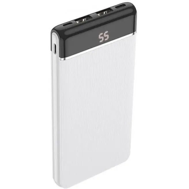 Внешний аккумулятор Hoco J59 Power Bank 10000 mAh - креативная реализация портативного зарядного устройства. Емкость батареи составляет 10000 mAh, сила тока - 2 A. Применение электронного контроллера, поддерживающего постоянные характеристики тока, позволяет аккумулятору выдерживать перезарядку длительное время без потери емкости. Небольшой экран аксессуара отображает уровень заряда в процентном соотношении. Корпус изготовлен из огнестойкого пластика, выполнен с приятной на ощупь рельефной поверхностью. Один из торцов устройства имеет глянцевую поверхность, реализован с закругленными гранями, в нем находятся два USB порта, для зарядки двух гаджетов и разъемы Type-C и Micro-USB. Рядом, на одной из боковых граней размещена кнопка, на другой - разъем Lightning. В комплект входит кабель Micro-USB.