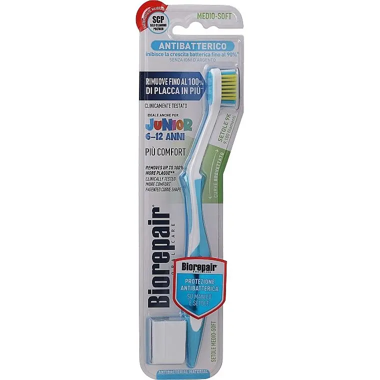 Зубная щетка Biorepair Совершенная чистка Junior рекомендуется для безопасной чистки зубов и десен для детей и подростков. Все детали щетки изготовлены из инновационного материала с бактериостатическим покрытием SCP (самоочищающийся полимер), благодаря которому бактерии не могут расти и размножаться.